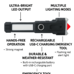 This rechargeable hammer torch is a multifunctional emergency flashlight designed to keep you prepared in critical situations. Combining a high-power LED torch, glass breaker, and seat belt cutter in one compact tool, it is an essential safety companion for car emergencies, outdoor adventures, and everyday home use.